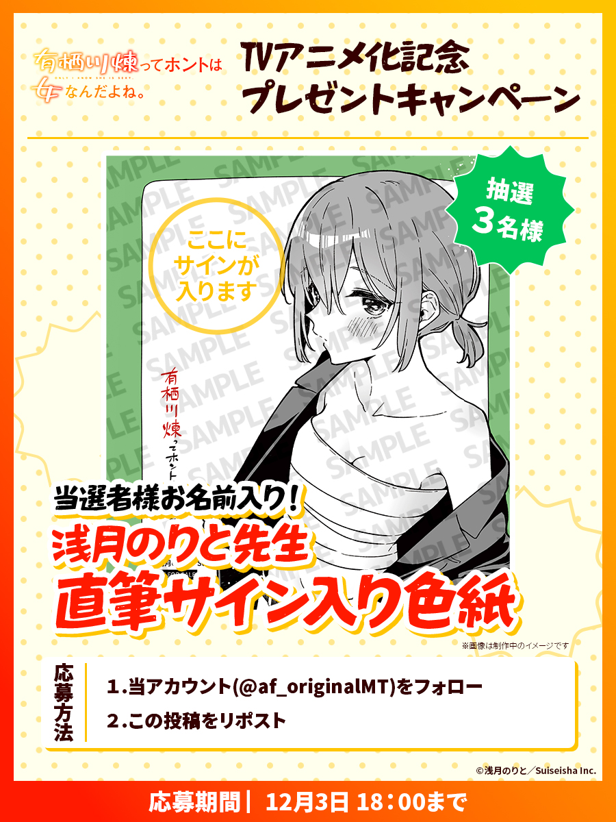 公式Xでは、TVアニメ化記念キャンペーンとして<当選者様お名前&浅月のりと先生直筆サイン入り複製色紙>を抽選で3名様にプレゼントするキャンペーンを実施しております。