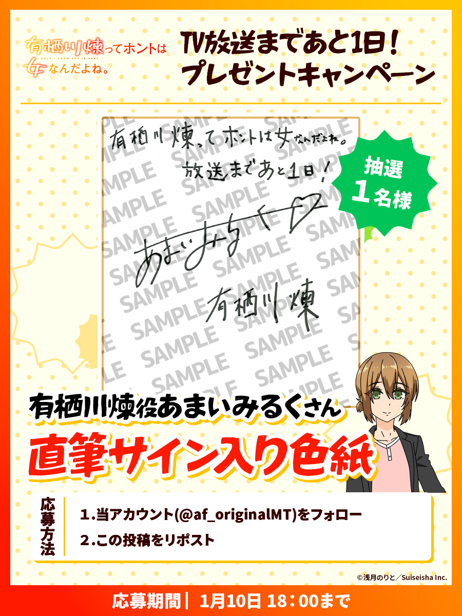 公式Xでは、TVアニメ放送まであと1日!カウントダウンキャンペーンとして<有栖川煉役 あまいみるくさん直筆サイン入り色紙>を抽選で1名様にプレゼントするキャンペーンを実施しております。